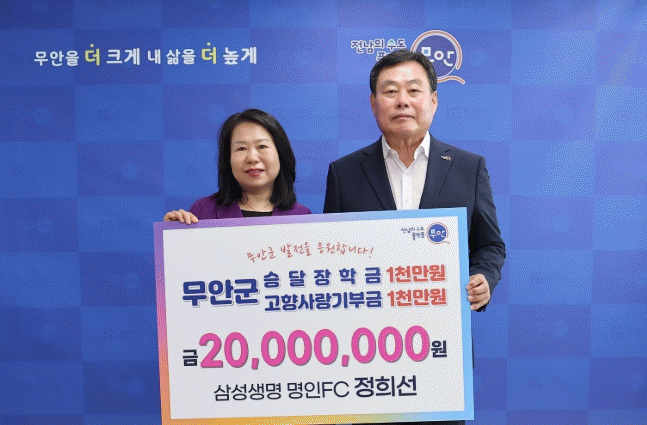 [¹Ìµð¾îÀü³² ±èÆÇ±¹ ±âÀÚ]Àü³² ¹«¾È±ºÀº 1ÀÏ »ï¼º»ý¸í Á¤Èñ¼± ¸íÀÎFC°¡ Áö¿ª ÀÎÀç ¾ç¼º°ú Áö¿ª ¹ßÀüÀ» À§ÇØ ¼ÒÁßÈ÷ ½á´Þ¶ó¸ç ½Â´ÞÀåÇÐ±Ý ¹× °íÇâ»ç¶û±âºÎ±Ý °¢ 1õ¸¸ ¿ø, ÃÑ 2õ¸¸ ¿øÀ» ±âŹÇß´Ù°í ¹àÇû´Ù. »ï¼º»ý¸í Á¤Èñ¼± ¸íÀÎFC´Â »ï¡¦