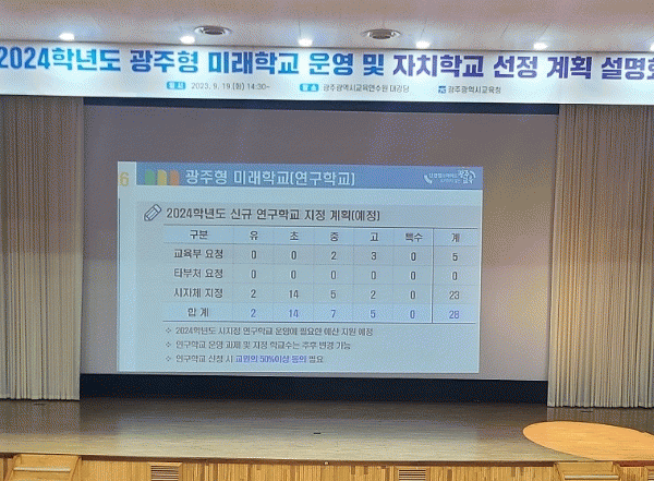[¹Ìµð¾îÀü³² Á¦°¥´ëÁ¾ ±âÀÚ]±¤Áֽñ³À°Ã»ÀÌ Áö³ 19ÀÏ °ü³» Çб³ ´ë»óÀ¸·Î ¡®2024Çг⵵ ±¤ÁÖÇü ¹Ì·¡Çб³ ¿î¿µ ¹× ÀÚÄ¡Çб³ ¼±Á¤ °èȹ ¼³¸íȸ¡¯À» °³ÃÖÇß´Ù°í ¹àÇû´Ù. À̹ø ¼³¸íȸ´Â ±¤ÁÖÇü ¹Ì·¡Çб³ ¿î¿µ ¾È³», ³»³âµµ ÀÚÄ¡Çб³ Á¦µµ °³¡¦