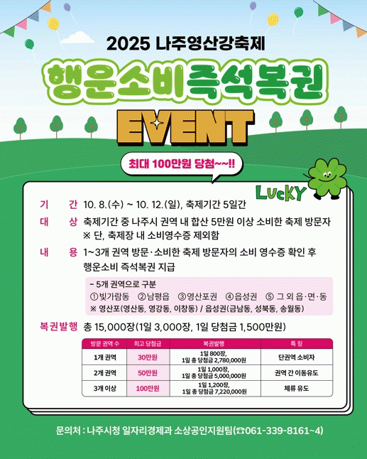 [¹Ìµð¾îÀü³² Á¦°¥´ëÁ¾ ±âÀÚ]Àü¶ó³²µµ ³ªÁֽð¡ ¡®2025 ³ªÁÖ¿µ»ê°ÃàÁ¦¡¯¸¦ ã´Â ½Ã¹Î°ú °ü±¤°´µé¿¡°Ô Ưº°ÇÑ Áñ°Å¿ò°ú ÇÔ²² Áö¿ª »ó±Ç Ȱ·ÂÀ» ºÒ¾î³Ö±â À§ÇØ ¡®Çà¿î ¼Òºñ Áï¼® º¹±Ç À̺¥Æ®¡¯¸¦ ÁøÇàÇÑ´Ù. ³ªÁÖ½Ã(½ÃÀå À±º´ÅÂ)´Â ¿À´Â 10¡¦