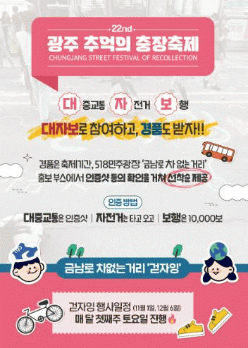 [¹Ìµð¾îÀü³² Á¦°¥´ëÁ¾ ±âÀÚ]±¤ÁÖ µ¿±¸´Â ¿À´Â 15ÀϺÎÅÍ 5Àϰ£ ±Ý³²·Î¿Í ÃæÀå·Î ÀÏ¿ø¿¡¼ ¿¸®´Â Á¦22ȸ ±¤ÁÖ Ãß¾ïÀÇ ÃæÀåÃàÁ¦¿¡¼ ¡®±Ý³²·Î Â÷ ¾ø´Â °Å¸®¡¯ÀÇ °¡Ä¡¸¦ ¾Ë¸®°í ´ëÀÚº¸ µµ½Ã Á¤Ã¥¿¡ ½Ã¹Î Âü¿©¸¦ È®´ëÇϱâ À§ÇÑ Æ¯º° È«º¸ À̺¥¡¦