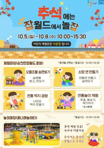 [¹Ìµð¾îÀü³² ÀÓ¼º¿Ï ±âÀÚ]¼øÃµ½Ã´Â ¿À´Â 10¿ù 5ÀϺÎÅÍ 8ÀϱîÁö Ãß¼® ¿¬ÈÞ¸¦ ¸Â¾Æ ¼øÃµ¸¸Àâ¿ùµå¿¡¼ 'Ãß¼®¿¡´Â Àâ¿ùµå¿¡¼ ³îJOB~'À̺¥Æ®¸¦ °³ÃÖÇÑ´Ù. À̹ø À̺¥Æ®´Â Ãß¼® ¿¬ÈÞ¸¦ ¸Â¾Æ ¾î¸°ÀÌ¿Í °¡Á·ÀÌ ÇÔ²² Áñ±æ ¼ö ÀÖ´Â ¼¼´ë °ø°¨ ÀüÅ롦