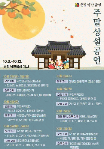[¹Ìµð¾îÀü³² ÀÓ¼º¿Ï ±âÀÚ]¼øÃµ½Ã´Â ¼øÃµ ³«¾ÈÀ¾¼º¿¡¼ 'ÁÖ¸» »ó¼³°ø¿¬'°ú '±èºó±æ À屺 â±Ø' °ø¿¬À» ¿À´Â 10¿ù 3ÀϺÎÅÍ 12ÀϱîÁö ¼±º¸ÀÎ´Ù°í ¹àÇû´Ù. À̹ø °ø¿¬Àº °¡À» ¿¬ÈÞ¿Í Ãß¼® ¸íÀý ºÐÀ§±â¸¦ ´õÇØ, °ü±¤°´°ú ½Ã¹ÎµéÀÌ ÇÔ²² ÀüÅë¹®¡¦
