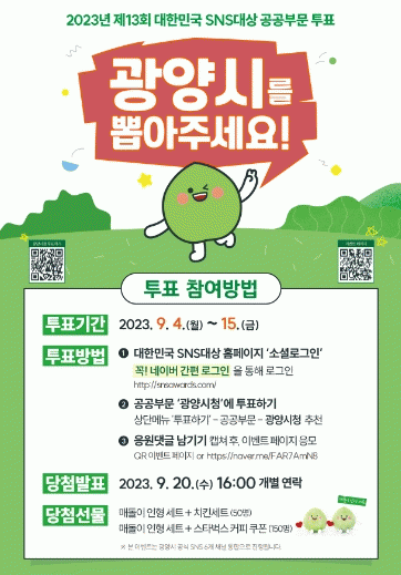 [¹Ìµð¾îÀü³² ÀÓ¼º¿Ï ±âÀÚ]±¤¾ç½Ã´Â ¿À´Â 4ÀϺÎÅÍ 15ÀϱîÁö Àü ±¹¹ÎÀ» ´ë»óÀ¸·Î ¡®2023³â Á¦13ȸ ´ëÇѹα¹ SNS ´ë»ó ÅõÇ¥ À̺¥Æ®¡¯¸¦ ÁøÇàÇÑ´Ù°í ¹àÇû´Ù. ´ëÇѹα¹ SNS ´ë»óÀº ¿Ã¹Ù¸¥ SNS Ȱ¿ë ¹®È¸¦ Á¤Âø½Ã۱â À§ÇØ 2011³âºÎÅÍ Á¦Á¤µÆ¡¦