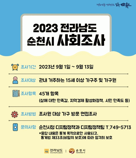 [¹Ìµð¾îÀü³² ÀÓ¼º¿Ï ±âÀÚ]¼øÃµ½Ã°¡ ½Ã¹ÎµéÀÇ »îÀÇ ÁúÀû ¼öÁذú »çȸ »óÅÂÀÇ º¯È¸¦ ÆÄ¾ÇÇØ Á¤Ã¥¼ö¸³ÀÇ ±âÃÊÀÚ·á·Î Ȱ¿ëÇϰíÀÚ ´ÙÀ½´Þ 1ÀϺÎÅÍ 13ÀϱîÁö ¡®2023³â Àü¶ó³²µµ¡¤¼øÃµ½Ã »çȸÁ¶»ç¡¯¸¦ ½Ç½ÃÇÑ´Ù. Á¶»ç´ë»óÀº ¼øÃµ½Ã Àüü °¡±¸¡¦