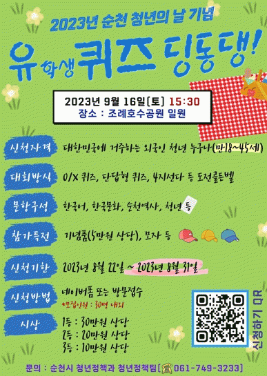 [¹Ìµð¾îÀü³² ÀÓ¼º¿Ï ±âÀÚ]¼øÃµ½Ã°¡ ¿À´Â 31ÀϱîÁö ¿Ü±¹ÀΠû³â ´ë»ó ÄûÁî´ëȸÀÎ ¡®À¯(Çлý)ÄûÁî µùµ¿´ó¡¯ Âü°¡ÀÚ 30¸íÀ» ¸ðÁýÇÑ´Ù. À̹ø ÄûÁî´ëȸ´Â ´ÙÀ½ ´Þ 16ÀÏ Á¶·ÊÈ£¼ö°ø¿ø¿¡¼ ÁøÇàÇÒ 2023³â ¼øÃµ û³âÀÇ ³¯ ±â³äÇà»ç¿¡¼ ´ëÇѹα¹¡¦