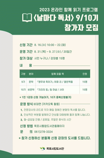 [¹Ìµð¾îÀü³² °í±Ô¼® ±âÀÚ]¸ñÆ÷½Ã¸³µµ¼°üÀº 9¿ù µ¶¼ÀÇ ´ÞÀ» ¸Â¾Æ ¿Â¶óÀÎ ÇÔ²² Àбâ ÇÁ·Î±×·¥ '2023 ³¯¸¶´Ù µ¶¼' 9-10±â Âü°¡ÀÚ¸¦ ¸ðÁýÇÑ´Ù. '³¯¸¶´Ù µ¶¼'´Â 2021³âºÎÅÍ ¿ì¸® Áö¿ª µ¶¼ ºÐÀ§±â¿¡ »õ·Î¿î º¯È¸¦ ÁÖ°íÀÚ ½ÃÀÛµÈ ¿Â¶óÀÎ ¡¦