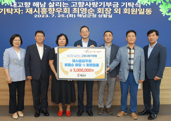 [¹Ìµð¾îÀü³² Á¦°¥´ëÁ¾ ±âÀÚ]ÇØ³²±º °íÇâ»ç¶û±âºÎÁ¦¿¡ Àü±¹ °¢Áö¿¡¼ ±âºÎ¹°°áÀÌ À̾îÁö°í ÀÖ´Ù. Àç½ÃÈïÇØ³²Çâ¿ìȸ¿¡¼´Â ÇØ³²±º¿¡ 500¸¸¿ø °íÇâ»ç¶û±âºÎ±ÝÀ» ±âºÎÇß´Ù. ¿ÃÇØ·Î ⸳ 20ÁÖ³âÀ» ¸ÂÀÌÇÑ Àç½ÃÈïÇØ³²Çâ¿ìȸ¿¡¼´Â °íÇâ»ç¶û¡¦
