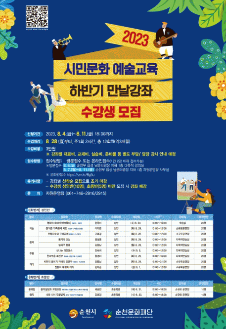 [¹Ìµð¾îÀü³² ÀÓ¼º¿Ï ±âÀÚ]¼øÃµ¹®ÈÀç´ÜÀº ¡®2023 ½Ã¹Î¹®È¿¹¼ú±³À° ÇϹݱ⠸¸³¯°Á¡¯¼ö°»ýÀ» 11ÀϱîÁö °Áº° ¼±Âø¼øÀ¸·Î ¸ðÁýÇÑ´Ù. À̹ø ¼ö°»ý ¸ðÁýÀº Áö³ÇØ¿Í ´Ù¸£°Ô 1ÀÎ 2°Á±îÁö ½ÅûÀÌ °¡´ÉÇϸç Ãʵî¹ÝÀÌ ½Å¼³µÆ´Ù. ¸¸³¯°Á´¡¦