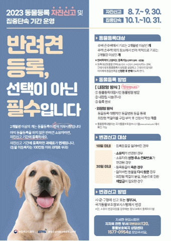 [¹Ìµð¾îÀü³² °í±Ô¼® ±âÀÚ]¸ñÆ÷½Ã´Â µ¿¹°µî·ÏÀ» Ȱ¼ºÈÇϱâ À§ÇØ ¹Ý·Á°ß µî·Ï ¹× º¯°æ»çÇ׿¡ ´ëÇÑ ÀÚÁø½Å°í ±â°£À» 7ÀϺÎÅÍ 9¿ù 30ÀϱîÁö ¿î¿µÇϰí, 10¿ù ÇÑ´Þ°£ ÁýÁß ´Ü¼Ó ÇÑ´Ù. µ¿¹°µî·ÏÁ¦´Â µ¿¹°º¸È£¹ý¿¡ µû¶ó ¹Ý·ÁÀÇ ¸ñÀûÀ¸·Î 2°³¿ù·É¡¦
