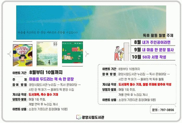 [¹Ìµð¾îÀü³² ÀÓ¼º¿Ï ±âÀÚ]±¤¾ç½Ã¸³µµ¼°üÀº Áö³ 3¿ù '2023 ¿ÃÇØÀÇ Ã¥' ¼±Á¤, ÀÛ°¡ÃÊû ºÏÄܼƮ, µ¶¼ ¸±·¹ÀÌ µî¿¡ ÀÌ¾î ¡®¿ÃÇØÀÇ Ã¥¡¯ Àбâ È®»êÀ» À§ÇØ 2023 ¿ÃÇØÀÇ Ã¥ ¿¬°è µ¶¼À̺¥Æ®¸¦ ÁøÇàÇÑ´Ù. 8¿ùºÎÅÍ 10¿ù±îÁö ±¤¾ç½Ã¸³µµ¼°ü¡¦