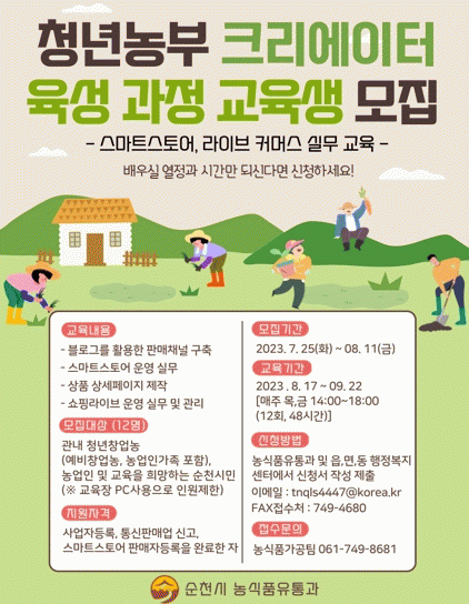 [¹Ìµð¾îÀü³² ÀÓ¼º¿Ï ±âÀÚ]¼øÃµ½Ã´Â ³ó»ê¹° ¿Â¶óÀÎ ÆÇ¸Å È®´ë¸¦ ÅëÇÑ ³ó¾÷ÀÎÀÇ ¼Òµæ Áõ´ë¸¦ À§ÇØ Ã»³â³óºÎ Å©¸®¿¡ÀÌÅÍ À°¼º ±³À°À» 8¿ù 17ÀϺÎÅÍ 9¿ù 22ÀϱîÁö 12ȸ ÃÑ 48½Ã°£ °úÁ¤À¸·Î ÃßÁøÇÑ´Ù. À̹ø ±³À°Àº ºòµ¥ÀÌÅ͸¦ Ȱ¿ëÇÑ ¿Â¶óÀνº¡¦