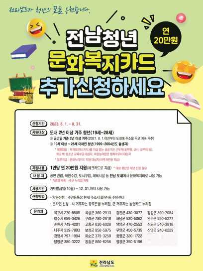 [¹Ìµð¾îÀü³² Á¦°¥´ëÁ¾ ±âÀÚ]Àü¶ó³²µµ´Â ¿¬ 20¸¸ ¿øÀÇ ¹®Èº¹Áöºñ¸¦ Áö¿øÇÏ´Â ¡®Ã»³â ¹®Èº¹ÁöÄ«µå¡¯»ç¾÷ Ãß°¡ ½ÅûÀ» 8¿ù ÇÑ ´Þ°£ ¹Þ´Â´Ù°í ¹àÇû´Ù. Áö¿ø ´ë»óÀº 2021³â 8¿ù 1ÀÏ ÀÌÀüºÎÅÍ Àü³²¿¡ °ÅÁÖÇÑ 1995~2004³â Ãâ»ý û³âÀÌ´Ù. ´Ù¸¸¡¦