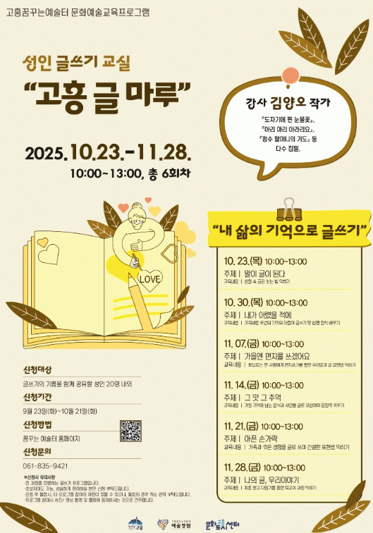 [¹Ìµð¾îÀü³² Á¦°¥´ëÁ¾ ±âÀÚ]°íÈﱺ°ú °íÈﱺ¹®Èµµ½Ã¼¾ÅÍ´Â ¿À´Â 10¿ùºÎÅÍ 11¿ù±îÁö '¼ºÀÎ ±Û¾²±â ±³½Ç: °íÈï ±Û¸¶·ç'¸¦ ¿î¿µÇÑ´Ù°í ¹àÇû´Ù. À̹ø ÇÁ·Î±×·¥Àº °íÈïÀÇ ÁßÀå³âÃþÀ» ´ë»óÀ¸·Î, Æò¹üÇÑ ÀÏ»ó ¼Ó °æÇèÀ» ±Û·Î Ç®¾î³»°í ¼·ÎÀÇ ¡¦