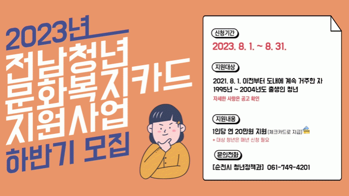 [¹Ìµð¾îÀü³² ÀÓ¼º¿Ï ±âÀÚ]¼øÃµ½Ã´Â 19~28¼¼ û³â¿¡°Ô ¿¬ 20¸¸ ¿ø ¹®Èº¹Áöºñ¸¦ Áö±ÞÇÏ´Â ¡®Àü³²Ã»³â ¹®Èº¹ÁöÄ«µå Áö¿ø»ç¾÷¡¯ÀÇ ÇϹݱâ Áö¿øÀÚ¸¦ 8¿ù ÇÑ ´Þ°£ ¸ðÁýÇÑ´Ù°í ¹àÇû´Ù. ´çÃÊ Àü³²Ã»³â ¹®Èº¹ÁöÄ«µå Áö¿ø»ç¾÷ÀÇ ¸ðÁý ÀοøÀº 21¡¦