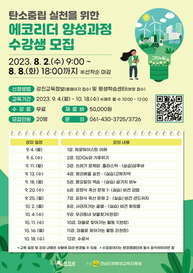 [¹Ìµð¾îÀü³² Á¦°¥´ëÁ¾ ±âÀÚ]°Áø±º Æò»ýÇнÀ¼¾ÅÍ´Â Àü³²Çü »ýÅÂÇнÀµµ½Ã Á¶¼ºÀ» À§ÇØ 8¿ù 2ÀϺÎÅÍ ¡®¿¡ÄÚ¸®´õ ¾ç¼º°úÁ¤¡¯ ¼ö°»ý 20¸íÀ» ¼±Âø¼ø ¸ðÁýÇÑ´Ù. ¿¡ÄÚ¸®´õ ¾ç¼º°úÁ¤Àº ±âÈÄ À§±â ½Ã´ë¿¡ ÀÏ»ó »ýȰ¿¡¼ ½Çõ °¡´ÉÇϰí Áö¼Ó °¡´É¡¦