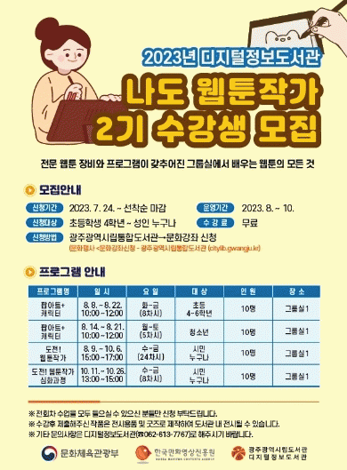 [¹Ìµð¾îÀü³² Á¦°¥´ëÁ¾ ±âÀÚ]±¤ÁÖ±¤¿ª½Ã¸³µðÁöÅÐÁ¤º¸µµ¼°üÀº ¡®³ªµµ À¥Å÷ÀÛ°¡¡¯ 2±â ¼ö°»ýÀ» 24ÀϺÎÅÍ ¼±Âø¼ø ¸ðÁýÇÑ´Ù. ±¤Áֽø³µðÁöÅÐÁ¤º¸µµ¼°üÀÌ ¿î¿µÇÏ´Â ÀÌ ÇÁ·Î±×·¥Àº ¹®ÈüÀ°°ü±¤ºÎ°¡ ÁÖÃÖÇϰí Çѱ¹¸¸È¿µ»óÁøÈï¿øÀÌ ÁÖ°üÇϴ¡¦