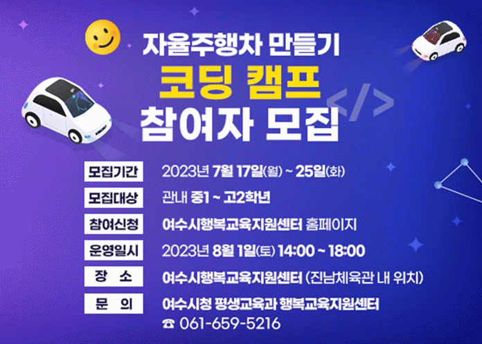 [¹Ìµð¾îÀü³² ÀüÇü¼º ±âÀÚ]¿©¼ö½Ã Çູ±³À°Áö¿ø¼¾ÅÍ¿¡¼ ¿À´Â 8¿ù 1ÀÏ ¿ÀÈÄ 2~6½Ã±îÁö ¿©¸§¹æÇРƯº° üÇè ÇÁ·Î±×·¥ ¡®ÀÚÀ²ÁÖÇàÂ÷ ¸¸µé±â ÄÚµù Ä·ÇÁ¡¯°¡ ¿¸°´Ù. À̹ø Ä·ÇÁ´Â ¹Ì·¡±â¼ú°ü·Ã âÀÛ Ã¼Çè ÇÁ·Î±×·¥ ÀÏȯÀ¸·Î ÁßÇлý 1Çгâ~°í¡¦