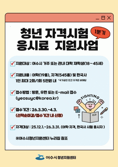 [¹Ìµð¾îÀü³² ÀüÇü¼º ±âÀÚ]¿©¼ö½Ã°¡ û³âµéÀÇ Ãë¾÷ °æÀï·Â °È¿Í ÀÚ°Ý Ãëµæ ¿ª·® Çâ»ó, °æÁ¦Àû ºÎ´ã ¿Ïȸ¦ À§ÇØ ¡®Ã»³â ÀڰݽÃÇè ÀÀ½Ã·á Áö¿ø»ç¾÷¡¯À» ÃßÁøÇÑ´Ù. À̹ø »ç¾÷Àº ¿©¼ö½Ã¿¡ Áֹεî·ÏÀ» µÐ 18¼¼ºÎÅÍ 45¼¼±îÁöÀÇ Ã»³â ¶Ç´Â °ü¡¦