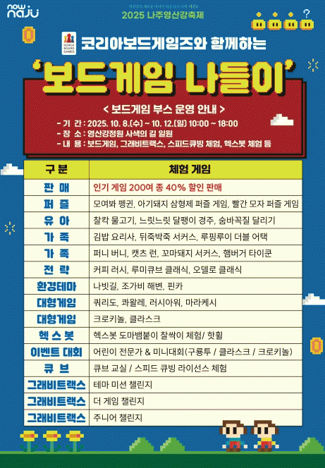 [¹Ìµð¾îÀü³² Á¦°¥´ëÁ¾ ±âÀÚ]Àü¶ó³²µµ ³ªÁֽð¡ ¿À´Â 10¿ù 8ÀϺÎÅÍ 12ÀϱîÁö ¿¸®´Â ¡®2025 ³ªÁÖ¿µ»ê°ÃàÁ¦¡¯¿¡¼ ³²³à³ë¼Ò ´©±¸³ª Áñ±æ ¼ö ÀÖ´Â ¡®º¸µå°ÔÀÓ ³ªµéÀÌ¡¯¸¦ ¿î¿µÇÑ´Ù. 26ÀÏ ³ªÁֽÿ¡ µû¸£¸é ¡®º¸µå°ÔÀÓ ³ªµéÀÌ¡¯´Â ±¹³» Ãִ롦