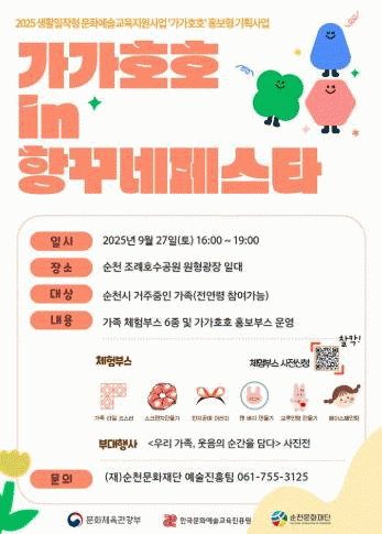 [¹Ìµð¾îÀü³² ÀÓ¼º¿Ï ±âÀÚ](Àç)¼øÃµ¹®ÈÀç´ÜÀº ¿À´Â 27ÀÏ Á¶·ÊÈ£¼ö°ø¿ø¿¡¼ ¡®2025 »ýȰ¹ÐÂøÇü ¹®È¿¹¼ú±³À°Áö¿ø»ç¾÷ '°¡°¡È£È£(ʫʥû¿û¿)'ÀÇ È«º¸ ÇÁ·Î±×·¥ÀÎ ¡®°¡°¡È£È£ in Ç×²Ù³×Æä½ºÅ¸¡¯¸¦ ¿î¿µÇÑ´Ù. ¡®°¡°¡È£È£¡¯´Â °¡Á· °£ ÀÌÇØ¸¦ ¡¦