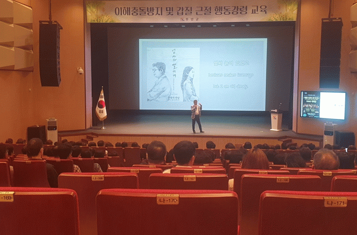 [¹Ìµð¾îÀü³² ±èÆÇ±¹ ±âÀÚ]Àü³² ¹«¾È±ºÀº Áö³ 28ÀÏ ½Â´Þ¹®È¿¹¼úȸ°ü¿¡¼ 400¿© °øÁ÷ÀÚ°¡ Âü¼®ÇÑ °¡¿îµ¥ ÀÌÇØÃæµ¹¹æÁö¹ý ¹× °©Áú ±ÙÀýÀ» À§ÇÑ Çൿ°·É ±³À°À» ½Ç½ÃÇß´Ù. À̹ø ±³À°Àº °øÁ÷ÀÚ°¡ °ø¹«¼öÇà Áß Á÷¸éÇÒ ¼ö ÀÖ´Â ÀÌÇØÃæµ¹ »ó¡¦