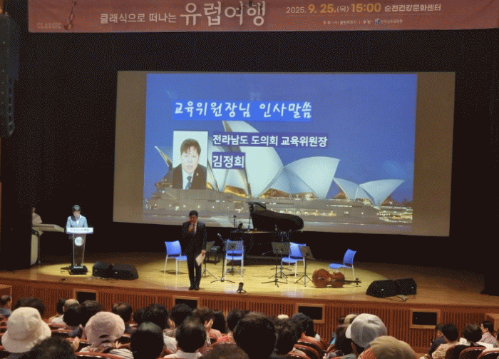 [¹Ìµð¾îÀü³² Á¦°¥´ëÁ¾ ±âÀÚ]±èÁ¤Èñ Àü¶ó³²µµÀÇȸ ±³À°À§¿øÀåÀº 9¿ù 25ÀÏ, ¼øÃµ°Ç°¹®È¼¾ÅÍ¿¡¼ ¿¸° ¡®Å¬·¡½ÄÀ¸·Î ¶°³ª´Â À¯·´ ¿¹¼ú ¿©Ç࡯ Çà»ç¿¡¼ Ãà»ç¸¦ ÅëÇØ û¼Ò³â°ú ½Ã¹Îµé¿¡°Ô µû¶æÇÑ °Ý·Á¿Í Èñ¸ÁÀÇ ¸Þ½ÃÁö¸¦ ÀüÇß´Ù. ±è À§¿ø¡¦
