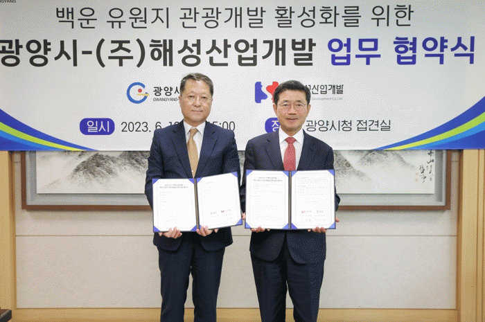 [¹Ìµð¾îÀü³² ÀÓ¼º¿Ï ±âÀÚ]±¤¾ç½Ã´Â Áö³ 19ÀÏ ¢ßÇØ¼º»ê¾÷°³¹ß°ú ¾÷¹« Çù¾àÀ» ü°áÇÏ°í ¹é¿îÀ¯¿øÁö °ü±¤°³¹ßÀ» À§ÇØ »óÈ£ Çù·ÂŰ·Î Çß´Ù°í ¹àÇû´Ù. ¢ßÇØ¼º»ê¾÷°³¹ßÀº ºÀ°¸é ºÀ´ç¸® »ê5-1¹øÁö ÀÏ¿ø¿¡ 29,533§³ 678¾ï¿øÀ» ÅõÀÚÇÏ¿© º¹ÇÕÈÞ¡¦