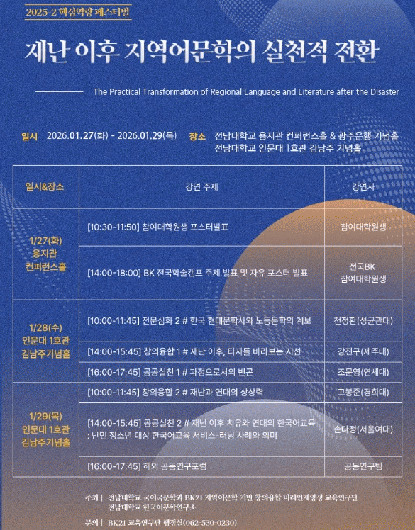 [¹Ìµð¾îÀü³² Á¦°¥´ëÁ¾ ±âÀÚ]Àü³²´ëÇб³ ±¹¾î±¹¹®Çаú BK21 FOUR ±³À°¿¬±¸´ÜÀÌ ¿À´Â 1¿ù 27ÀϺÎÅÍ 29ÀϱîÁö 3Àϰ£ Çٽɿª·®Æä½ºÆ¼¹úÀ» °³ÃÖÇÑ´Ù. À̹ø Çà»çÀÇ ÁÖÁ¦´Â ¡°Àç³ ÀÌÈÄ Áö¿ª¾î¹®ÇÐÀÇ ½ÇõÀû Àüȯ¡±À¸·Î, »çȸÀû¡¤±¸Á¶Àû À糿¡¡¦