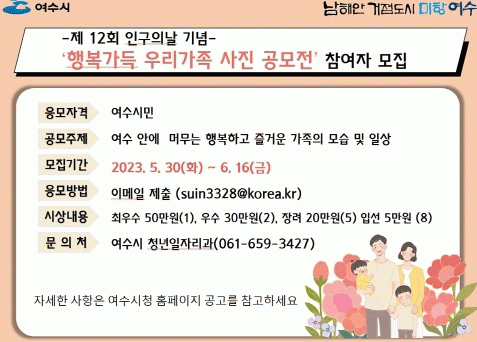[¹Ìµð¾îÀü³² ÀüÇü¼º ±âÀÚ]¿©¼ö½Ã°¡ Á¦12ȸ Àα¸ÀÇ ³¯À» ±â³äÇØ ¡®Çູ°¡µæ ¿ì¸® °¡Á·¡¯ »çÁø °ø¸ðÀüÀ» °³ÃÖÇÑ´Ù. À̹ø °ø¸ðÀüÀº 7¿ù 11ÀÏ ¼¼°è Àα¸ÀÇ ³¯À» ¸Â¾Æ Àα¸¹®Á¦ ±Øº¹¿¡ ´ëÇÑ ¹ü½Ã¹Î µ¿Âü ¹× °¡Á·Ä£ÈÀû ºÐÀ§±â¸¦ Á¶¼ºÄÚÀÚ ¸¶¡¦