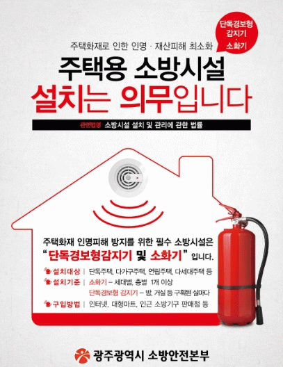 [¹Ìµð¾îÀü³² Á¦°¥´ëÁ¾ ±âÀÚ]±¤ÁÖ±¤¿ª½Ã¼Ò¹æ¾ÈÀüº»ºÎ´Â ÁÖÅà ÈÀçÀÇ ¿øÃµÀû ¿¹¹æ°ú Ãʱâ´ëÀÀÀ» À§ÇØ ¿ÃÇØ 1¸¸5310°¡±¸¸¦ ´ë»óÀ¸·Î ÁÖÅÃ¿ë ¼Ò¹æ½Ã¼³À» º¸±ÞÇÑ´Ù. ÁÖÅÃ¿ë ¼Ò¹æ½Ã¼³Àº ¡®¼Ò¹æ½Ã¼³ ¼³Ä¡ ¹× °ü¸®¿¡ °üÇÑ ¹ý·ü¡¯¿¡ µû¶ó ÁÖÅÿ¡ ¡¦