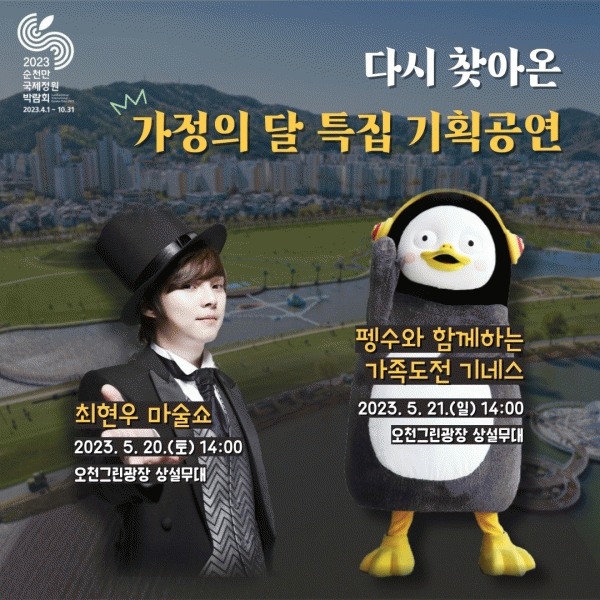 [¹Ìµð¾îÀü³² ÀÓ¼º¿Ï ±âÀÚ] ¼øÃµ¸¸±¹Á¦Á¤¿ø¹Ú¶÷ȸÁ¶Á÷À§¿øÈ¸´Â ¿ìõÀ¸·Î ¿¬±âµÈ °¡Á¤ÀÇ ´Þ ƯÁý ±âȹ°ø¿¬ ¡®ÃÖÇö¿ì ¸¶¼ú¼î¡¯¿Í ¡®Æë¼ö¿Í ÇÔ²²ÇÏ´Â °¡Á·µµÀü ±â³×½º¡¯¸¦ °¢°¢ ¿À´Â 20ÀÏ ¿ÀÈÄ 2½Ã, 21ÀÏ ¿ÀÈÄ 2½Ã¿¡ ¿Àõ±×¸°±¤Àå »ó¼³¹«´ë¿¡¡¦