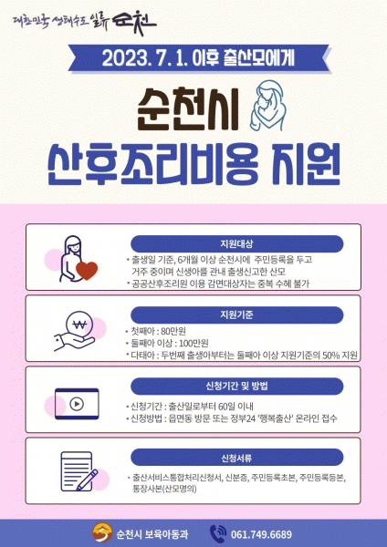 [¹Ìµð¾îÀü³² ÀÓ¼º¿Ï ±âÀÚ] ¼øÃµ½Ã´Â ¿À´Â 7¿ù 1ÀϺÎÅÍ °ü³» Ãâ»ê¸ð¸¦ ´ë»óÀ¸·Î »êÈÄÁ¶¸®ºñ¿ëÀ» Áö¿øÇÑ´Ù°í ¹àÇû´Ù. Áö¿ø ´ë»óÀº Ãâ»êÀÏ ±âÁØ, 6°³¿ù ÀüºÎÅÍ ½Ã¿¡ Áֹεî·ÏÀ» µÎ°í ½ÇÁ¦ °ÅÁÖ ÁßÀÌ¸ç ½Å»ý¾Æ¸¦ ¼øÃµ¿¡ Ãâ»ý ½Å°íÇÑ »ê¸ðÀÌ´Ù¡¦