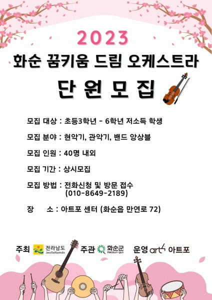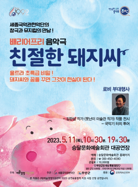 [¹Ìµð¾îÀü³² ±èÆÇ±¹ ±âÀÚ] Àü³² ¹«¾È±ºÀº ¿¹¼ú°æ¿µÁö¿ø¼¾ÅͰ¡ ÁÖÃÖÇÏ°í ¹®ÈüÀ°°ü±¤ºÎ°¡ ÈÄ¿øÇÏ´Â ¡®2023 °ø¿¬À¯ÅëÇù·ÂÁö¿ø °ø¸ð»ç¾÷ ¼±Á¤°ø¿¬¡¯ ¡®¹è¸®¾îÇÁ¸® À½¾Ç±Ø ¡®Ä£ÀýÇÑ µÅÁö¾¾¡¯¡¯¸¦ 5¿ù 11ÀÏ 10½Ã 30ºÐ, 19½Ã 30ºÐ ½Â´Þ¹®È¿¹¼ú¡¦