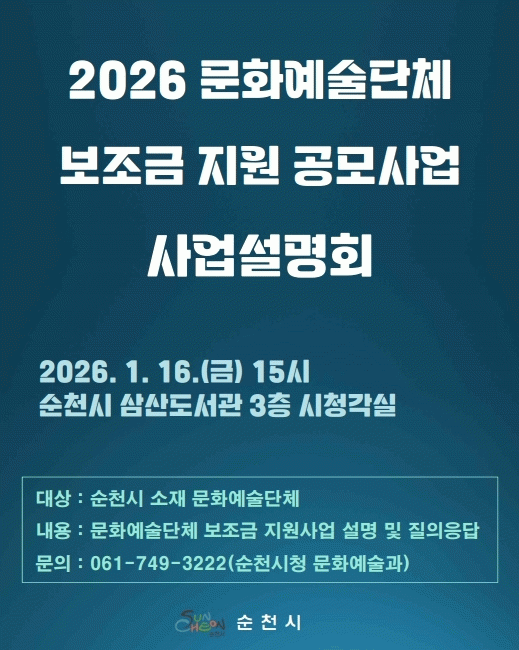 [¹Ìµð¾îÀü³² ÀÓ¼º¿Ï ±âÀÚ]¼øÃµ½Ã´Â ¿À´Â 16ÀÏ ¿ÀÈÄ 3½Ã, »ï»êµµ¼°ü 3Ãþ ½Ãû°¢½Ç¿¡¼ ¼øÃµ½Ã ¹®È¿¹¼ú´Üü¸¦ ´ë»óÀ¸·Î ¡®2026³â ¼øÃµ½Ã ¹®È¿¹¼ú´Üü º¸Á¶±Ý Áö¿ø»ç¾÷ ¼³¸íȸ¡¯¸¦ °³ÃÖÇÑ´Ù°í ¹àÇû´Ù. À̹ø ¼³¸íȸ´Â °ø¸ð»ç¾÷ÀÇ ¼¼ºÎ ³»¡¦