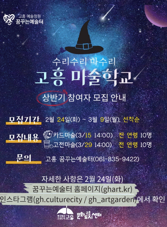 [¹Ìµð¾îÀü³² Á¦°¥´ëÁ¾ ±âÀÚ]°íÈﱺÀº ¸¶¼úÀ» ¸Å°³·Î âÀǷ°ú ÁýÁß·Â, ÀڽۨÀ» ±â¸¦ ¼ö Àִ üÇèÇü ¹®È¿¹¼ú±³À° ÇÁ·Î±×·¥ÀÎ ¡®¼ö¸®¼ö¸® ¸¶¼ö¸® '°íÈï ¸¶¼úÇб³'¡¯ÀÇ »ó¹Ý±â Âü¿©ÀÚ¸¦ ¸ðÁýÇÑ´Ù. À̹ø »ó¹Ý±â '°íÈï ¸¶¼úÇб³'´Â ¿¬·É¿¡¡¦