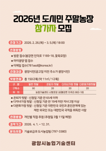 [¹Ìµð¾îÀü³² ÀÓ¼º¿Ï ±âÀÚ]±¤¾ç½Ã´Â µµ½É ¼Ó¿¡¼ ³ó¾÷À» üÇèÇÏ¸ç °¡Á·°ú ÇÔ²² °Ç°ÇÑ ¿©°¡¸¦ º¸³¾ ¼ö ÀÖ´Â ¡®2026³â µµ½Ã¹Î ÁÖ¸»³óÀ塯 Âü°¡ÀÚ¸¦ 2¿ù 26ÀϺÎÅÍ 3¿ù 5ÀϱîÁö ¸ðÁýÇÑ´Ù°í ¹àÇû´Ù. µµ½Ã¹Î ÁÖ¸»³óÀåÀº ½Ã¹ÎÀÌ ÀÏÁ¤ ±¸È¹ÀÇ ÅÔ¡¦
