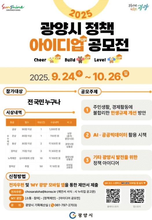 [¹Ìµð¾îÀü³² ÀÓ¼º¿Ï ±âÀÚ]±¤¾ç½Ã´Â 9¿ù 24ÀϺÎÅÍ 10¿ù 26ÀϱîÁö ¡®2025³â ÇϹݱ⠾ÆÀ̵ð¾î °ø¸ðÀü¡¯À» ½Ç½ÃÇÑ´Ù°í ¹àÇû´Ù. °ø¸ðÀü ¸íĪÀº'±¤¾ç½Ã Á¤Ã¥ ¾ÆÀ̵ð¾÷(UP) °ø¸ðÀü'À¸·Î, ½Ã¹ÎµéÀÇ »îÀ» ÀÀ¿øÇϰí(Cheer up), ´õ ³ªÀº Á¤Ã¥À» ÇÔ²²¡¦