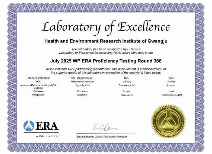 [¹Ìµð¾îÀü³² Á¦°¥´ëÁ¾ ±âÀÚ]±¤ÁÖ±¤¿ª½Ã º¸°Çȯ°æ¿¬±¸¿øÀÌ ÃÖ±Ù ¹Ì±¹ ȯ°æÀÚ¿øÇùȸ(ERA)°¡ ÁÖ°üÇÑ ¼öÁúºÐ¾ß ±¹Á¦ ¼÷·Ãµµ½ÃÇè¿¡¼ Àü Ç׸ñ ¡®¸¸Á·(Satisfactory)¡¯ ÆÇÁ¤À» ¹Þ¾Æ ¡®2025 ÃÖ¿ì¼ö ºÐ¼®±â°ü(Laboratory of Excellence)¡¯À¸·Î ¼±¡¦