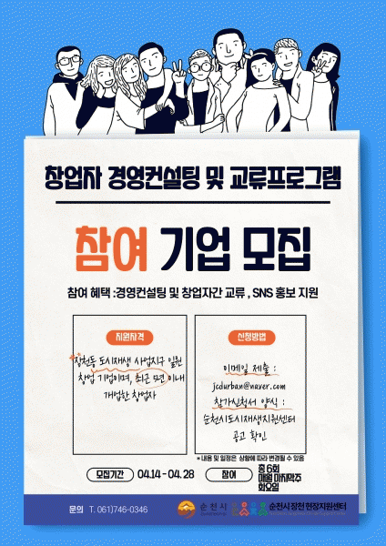 [¹Ìµð¾îÀü³² ÀÓ¼º¿Ï ±âÀÚ] ¼øÃµ½Ã´Â Á¾ÇÕ¹ö½ºÅ͹̳ΠÀÏ¿ø µµ½ÃÀç»ý Ȱ¼ºÈ »ç¾÷±¸¿ªÀ» ´ë»óÀ¸·Î â¾÷ÀÚ °æ¿µ ÄÁ¼³ÆÃ ¹× ±³·ùÇÁ·Î±×·¥ ½ÅûÀÚ¸¦ ¿À´Â 28ÀϱîÁö ¸ðÁýÇÑ´Ù. â¾÷ÀÚ °æ¿µ ÄÁ¼³ÆÃ ¹× ±³·ùÇÁ·Î±×·¥Àº ¼øÃµ½Ã Á¾ÇÕ¹ö½ºÅ͹̳ΠÀÏ¡¦