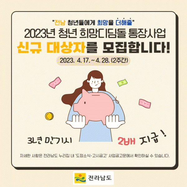 [¹Ìµð¾îÀü³² Á¦°¥´ëÁ¾ ±âÀÚ] Àü¶ó³²µµ´Â û³âÀÌ Áö¿ª¿¡¼ ¾ÈÁ¤ÀûÀ¸·Î ¹Ì·¡¸¦ ¼³°èÇϵµ·Ï Áö¿øÇÏ´Â ¡®2023³â û³â Èñ¸Áµðµõµ¹ ÅëÀ塯 ½Å±Ô ´ë»óÀÚ¸¦ Ãß°¡ ¸ðÁýÇÑ´Ù°í ¹àÇû´Ù. ½Åû ´ë»óÀº °ø°íÀÏ ±âÁØ ¸¸ 18~39¼¼ û³âÀ¸·Î Àü³²¿¡ Áֹε