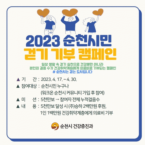 [¹Ìµð¾îÀü³² ÀÓ¼º¿Ï ±âÀÚ] ¼øÃµ½Ã°¡ ½Ã¹ÎÀÇ °Ç°ÇÑ °ÉÀ½ÀÌ °Ç° Ãë¾à°èÃþ¿¡°Ô ±âºÎ±ÝÀ¸·Î Àü´ÞµÇ´Â ¡®½Ã¹Î °È±â ±âºÎ Ä·ÆäÀΡ¯À» °³ÃÖÇØ ½Ã¹ÎÀÇ °Ç°°ú ³ª´®¹®È¸¦ µ¿½Ã¿¡ ì±ä´Ù°í ¹àÇû´Ù. À̹ø Ä·ÆäÀÎÀº ¿À´Â 17ÀϺÎÅÍ 12¿ù±îÁö 9°³¡¦