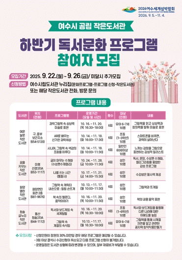[¹Ìµð¾îÀü³² ÀüÇü¼º ±âÀÚ]¿©¼ö½Ã´Â 9¿ù 22ÀϺÎÅÍ 26ÀϱîÁö °ø¸³ ÀÛÀºµµ¼°ü ¡®2025³â ÇϹݱ⠵¶¼¹®È ÇÁ·Î±×·¥¡¯ ¼ö°»ýÀ» ¸ðÁýÇÑ´Ù. À̹ø ÇÁ·Î±×·¥Àº À¯¾ÆºÎÅÍ ¼ºÀαîÁö ´Ù¾çÇÑ ¿¬·ÉÃþÀÌ Âü¿©ÇÒ ¼ö ÀÖµµ·Ï ÃÑ 9°³·Î ¸¶·ÃµÆÀ¸¸ç ¿À´Â 1¡¦