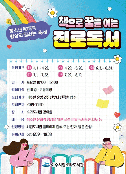 [¹Ìµð¾îÀü³² ÀüÇü¼º ±âÀÚ] ¿©¼ö½Ã°¡ ¿À´Â 31ÀϱîÁö ¡®Ã¥À¸·Î ²ÞÀ» ¿©´Â Áø·Îµ¶¼¡¯ 1±â Âü¿©ÀÚ 20¸íÀ» ¸ðÁýÇÑ´Ù. ¡®Ã¥À¸·Î ²ÞÀ» ¿©´Â Áø·Îµ¶¼¡¯´Â Áß¡¤°íµîÇлýÀ» ´ë»óÀ¸·Î û¼Ò³â ¹®ÇØ·Â Çâ»óÀ» À§ÇÑ ±Û¾²±â ¼ö¾÷ ¹× µ¶¼ Åä·ÐÀ» Áöµµ¡¦