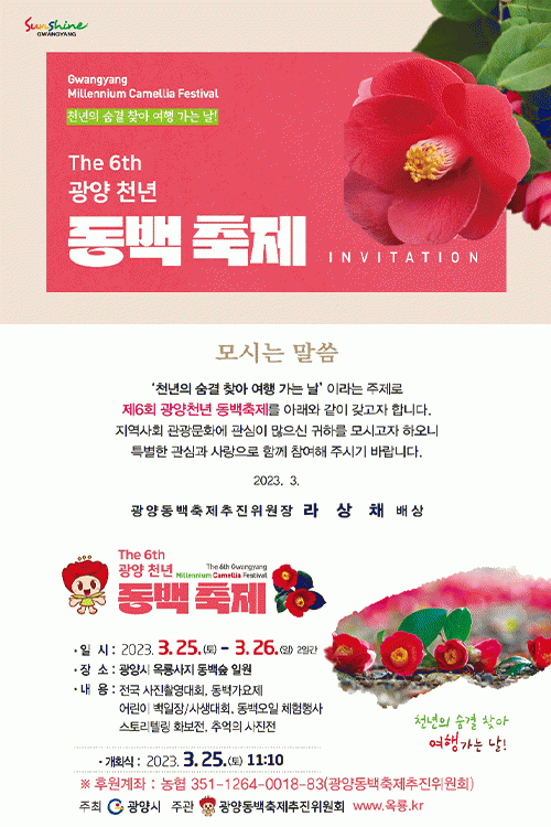 [¹Ìµð¾îÀü³² ÀÓ¼º¿Ï ±âÀÚ] ±¤¾ç½Ã´Â ¿À´Â 25ÀϺÎÅÍ 26ÀϱîÁö ¿Á·æ»çÁö µ¿¹é ½£ ÀÏ¿ø¿¡¼ ¡®Ãµ³âÀÇ ¼û°á ã¾Æ ¿©Çà°¡´Â ³¯¡¯À̶ó´Â ÁÖÁ¦·Î ¡®Á¦6ȸ ±¤¾çõ³â µ¿¹éÃàÁ¦¡¯°¡ °³ÃÖµÈ´Ù°í ¹àÇû´Ù. ±¤¾çµ¿¹éÃàÁ¦ÃßÁøÀ§¿øÈ¸ ÁÖ°üÀ¸·Î °³ÃֵǴ ¡¦