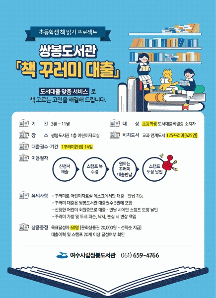 [¹Ìµð¾îÀü³² ÀüÇü¼º ±âÀÚ] ¿©¼ö½Ã°¡ ÃʵîÇлý Ã¥ Àб⸦ À§ÇÑ ¡®Ã¥ ²Ù·¯¹Ì ´ëÃ⡯À» ½ÃÇàÇÑ´Ù. ¡®Ã¥ ²Ù·¯¹Ì ´ëÃ⡯Àº ÃʵîÇлý ´Ü°èº° ±³°ú ¿¬°èµµ¼¸¦ ²Ù·¯¹Ì·Î ´ëÃâÇØ ÁÖ´Â Á¦µµ·Î µµ¼´ëÃâȸ¿øÀ̶ó¸é ½ÖºÀµµ¼°ü 1Ãþ ¾î¸°ÀÌÀÚ·á½Ç¡¦