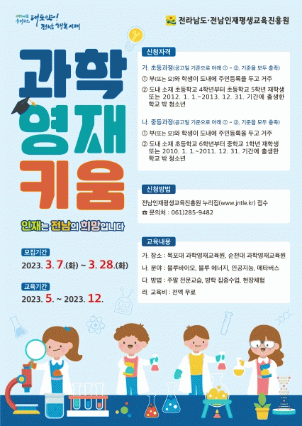 [¹Ìµð¾îÀü³² Á¦°¥´ëÁ¾ ±âÀÚ] Àü¶ó³²µµ´Â Áö¿ª Àü¹®±â°ü ½Ã¼³À» Ȱ¿ëÇØ °úÇп¡ Àç´É ÀÖ´Â Çлý¿¡°Ô ü°èÀû Àü¹®±³À°À» ¹«·á·Î Áö¿øÇÏ´Â ¡®2023³â °úÇпµÀçŰ¿ò¡¯ Âü°¡ÀÚ¸¦ ¸ðÁýÇÑ´Ù. Àü³²¿¡ Áֹεî·ÏÀ» µÎ°í °ÅÁÖÇÏ´Â ÃʵîÇб³ 4ÇгâºÎÅÍ¡¦