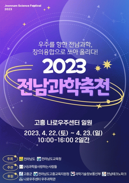 [¹Ìµð¾îÀü³² Á¦°¥´ëÁ¾ ±âÀÚ] Àü³² ÇлýµéÀÇ °úÇп¡ ´ëÇÑ È£±â½É°ú ¿Á¤ÀÌ ¹ßÇöµÉ 2023 Àü³²°úÇÐÃàÀüÀÌ ¿ìÁÖÇ×°øÀÇ ¸ÞÄ«ÀÎ °íÈï¿¡¼ ¿¸°´Ù. Àü¶ó³²µµ±³À°Ã»Àº ¿À´Â 4¿ù 22ÀÏ~23ÀÏ ÀÌÆ² °£ °íÈï ³ª·Î¿ìÁÖ¼¾ÅÍ ÀÏ¿ø¿¡¼ ¡®¿ìÁÖ¸¦ ÇâÇÑ Àü¡¦