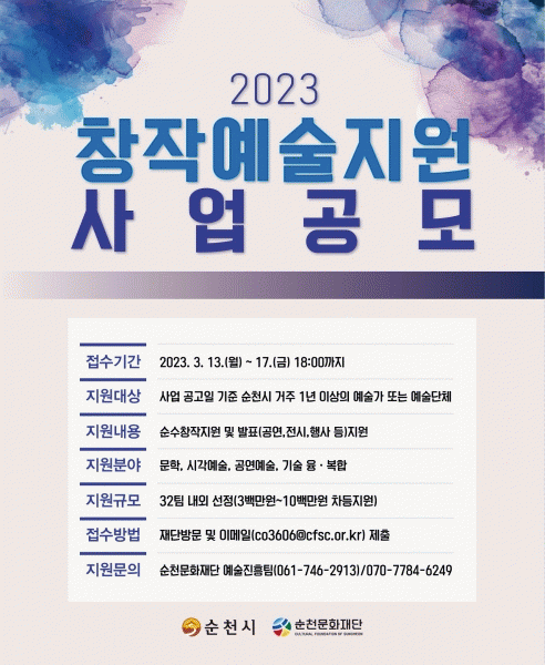 [¹Ìµð¾îÀü³² ÀÓ¼º¿Ï ±âÀÚ] ¼øÃµ¹®ÈÀç´ÜÀº ¡®2023 âÀÛ¿¹¼úÁö¿ø °ø¸ð»ç¾÷¡¯ Âü¿©¿¹¼úÀÎÀ» 17ÀϱîÁö °ø°³ ¸ðÁýÇÑ´Ù. ¡®Ã¢ÀÛ¿¹¼úÁö¿ø °ø¸ð»ç¾÷¡¯Àº Áö¿ª¿¹¼úÀεéÀÇ ¼ø¼öâÀÛȰµ¿ ¹× ¹ßÇ¥Áö¿øÀ» ÅëÇØ ¹®È¿¹¼úÀΰú ¹®È¿¹¼ú´ÜüÀÇ µ¶Ã¢ÀûÀÌ¡¦