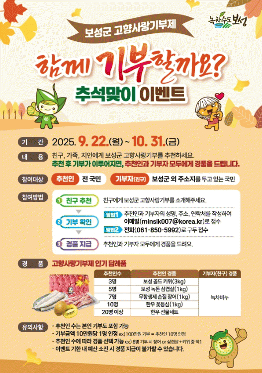 [¹Ìµð¾îÀü³² Á¦°¥´ëÁ¾ ±âÀÚ] º¸¼º±ºÀº ´Ù°¡¿À´Â Ãß¼®À» ¸Â¾Æ °íÇâ»ç¶û±âºÎÁ¦ Ȱ¼ºÈ¸¦ À§ÇØ ¡®ÇÔ²² ±âºÎÇÒ±î¿ä? Ãß¼®¸ÂÀÌ À̺¥Æ®¡¯¸¦ ¿À´Â 9¿ù 22ÀϺÎÅÍ 10¿ù 31ÀϱîÁö ÁøÇàÇÑ´Ù°í ¹àÇû´Ù. À̹ø À̺¥Æ®´Â ±º¹Î°ú ÃâÇâÀÎ, ÁöÀεéÀÌ ÇÔ¡¦