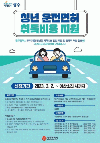 [¹Ìµð¾îÀü³² Á¦°¥´ëÁ¾ ±âÀÚ] ±¤ÁÖ±¤¿ª½Ã´Â Ãë¾à°èÃþ û³âÀÇ ±¸Á÷Ȱµ¿À» µ½°í °æÁ¦Àû ºÎ´ãÀ» ÁÙÀ̱â À§ÇØ Ã»³â 500¸í¿¡°Ô ¿îÀü¸éÇã Ãëµæ ºñ¿ëÀ» Áö¿øÇÑ´Ù. ¡®Ã»³â ¿îÀü¸éÇã Ãëµæºñ¿ë Áö¿ø»ç¾÷¡¯Àº û³âÀÇ ¿îÀü¸éÇã Çпø ¼ö°·á¿Í ¸éÇã ¡¦